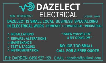 Dazelect Electrical is a local business situated in Gladstone QLD specializing in Electrical work. Domestic / commercial & Industrial. No job too small, free quotes.